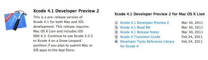 It can be mention that the first preview of Xcode 4.1 was seeded on February 24th.