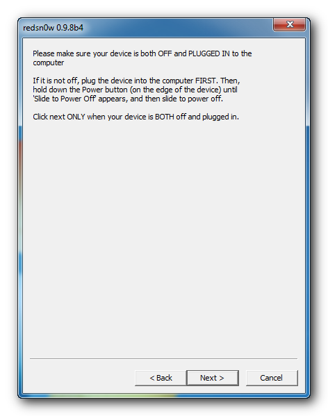 Since this is a tethered jailbreak you must use Redsn0w to help you boot back into your jailbroken device if its powered off for any reason. Simply connect your iPhone to the computer, launch RedSn0w, select Just boot tethered right now from the options window and click Next to have RedSn0w boot your device.