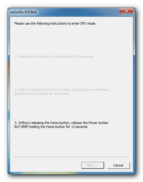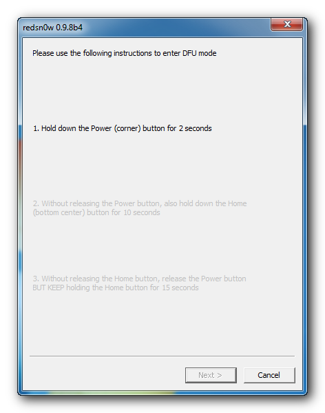 RedSn0w will now guide you through the steps to get into DFU mode.