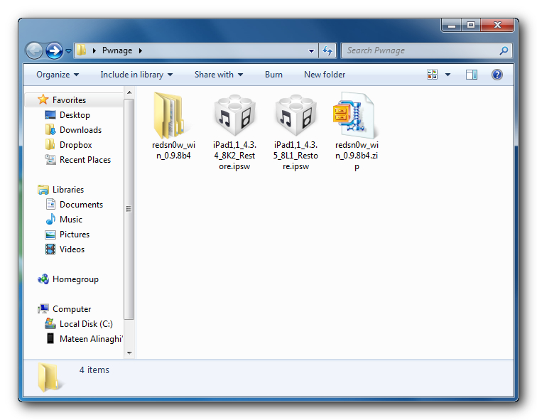 Download RedSn0w from here and place it in the Pwnage folder. Likewise, download the latest 4.3.4 and 4.3.5 firmware from below and place it in the same folder.
