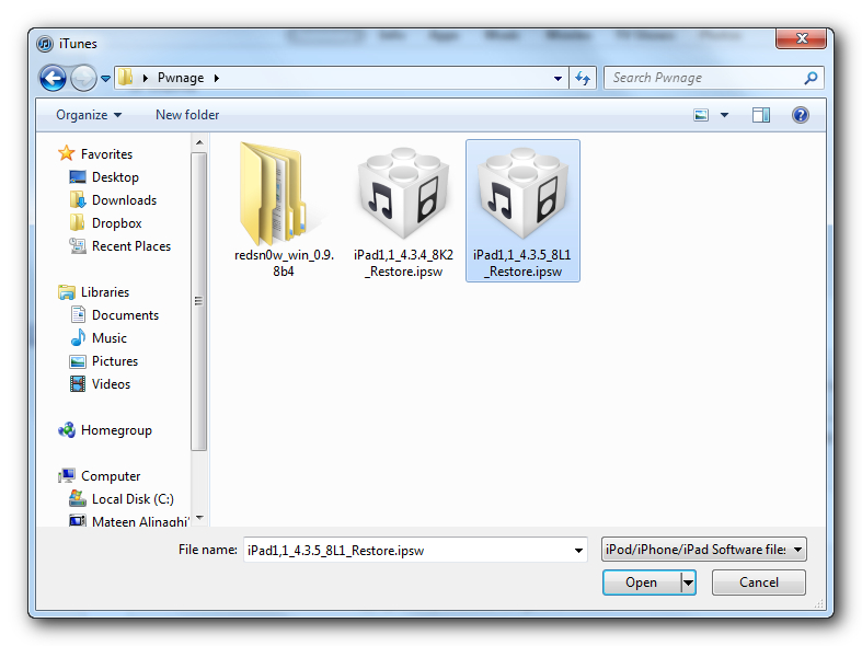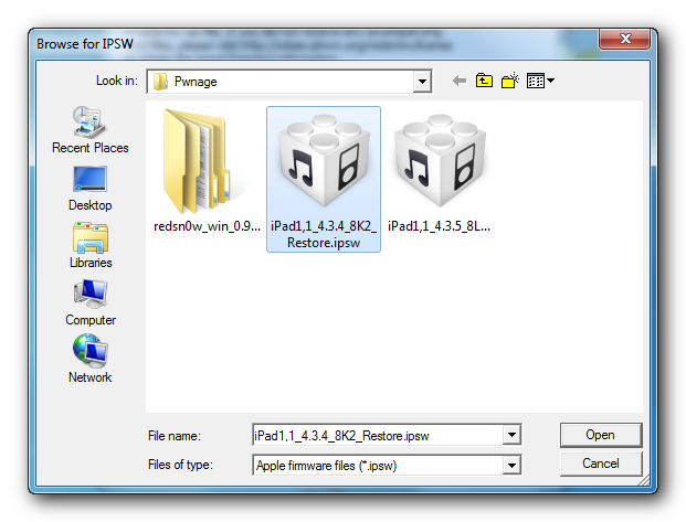 Select the 4.3.5 firmware ipsw we placed in the Pwnage folder on our desktop then click Open.