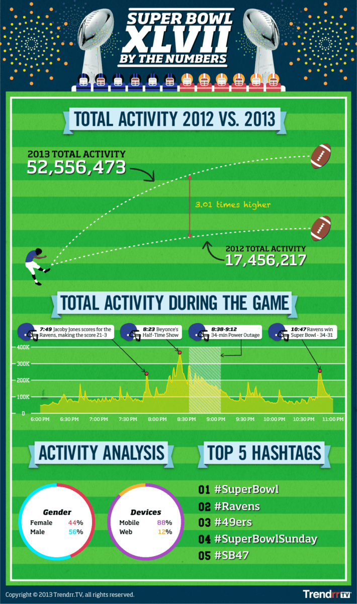 Trendrr has created a very interesting infographic detailing the social media activity that happened through the Super Bowl this year. The infographic is posted below, so go ahead and feast your eyes with big numbers.