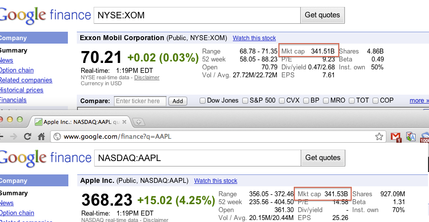 The markets are still open and volatile today but at 1:19PM EDT, Apple’s market capital is at $341.53B while Exxon Mobile’s is at $341.51B.