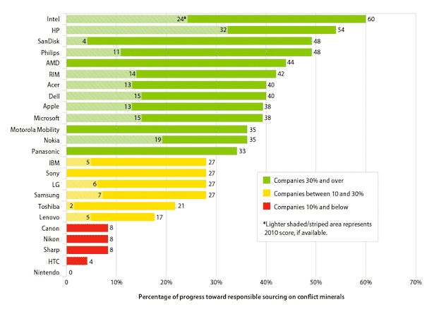 This has been reported by the Enough Project in a report titled ‘Taking Conflict Out of Consumer Gadgets: Company Rankings on Conflict Minerals 2012.’